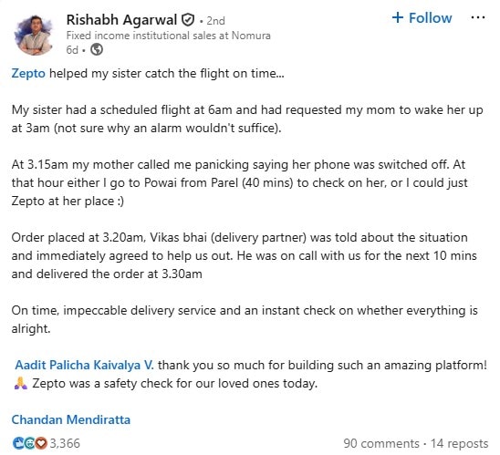 After the story went viral, senior officials from Zepto responded on social media. Chief Brand Officer Chandan Mendiratta jokingly said that while the company delivers alarm clocks, they never expected to act as one. Chief Operating Officer Vikas Sharma praised the delivery partner for going beyond his duty.
